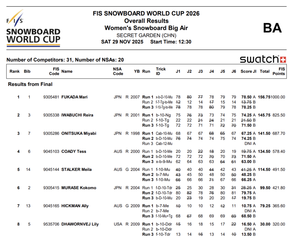 スノーボードのワールドカップ(W杯)は現地時間11月29日、中国のシークレットガーデンで今シーズン初戦となるFISビッグエア・ワールドカップの決勝が行われました。女子では深田 茉莉(YAMAZEN)が1位、岩渕麗楽(BURTON)が2位、鬼塚 雅(ISPSスキー&スノーボードチーム)が3位を獲得し、日本女子が表彰台を独占する大活躍となりました。男子では木俣 椋真(YAMAZEN)が3位を獲得しました。