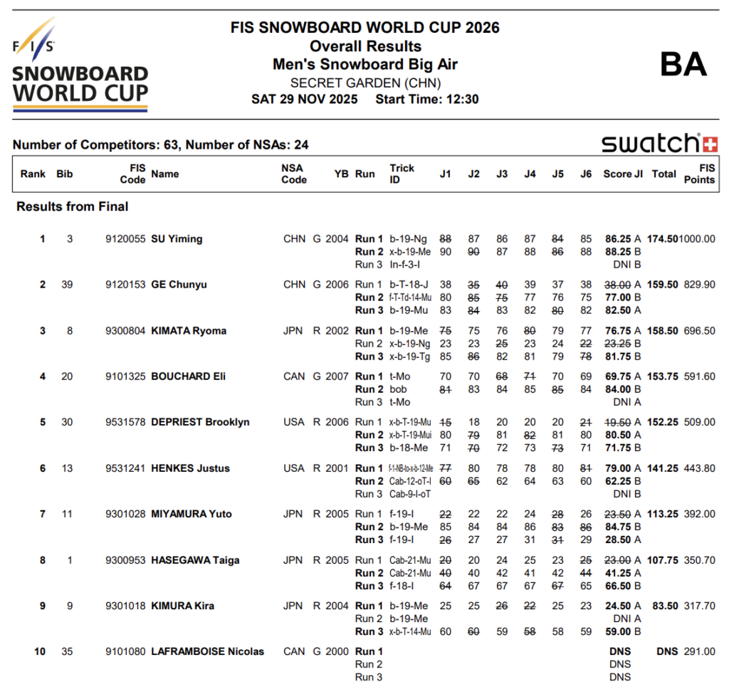 木俣 椋真は1本目にBS1980(5回転半)メラン、3本目にSWB1980(5回転半)ノーズを成功させ合計158.85ポイントで3位を獲得しました。2位との得点差は僅かの1ポイントで、僅差での3位でフィニッシュとなりました。