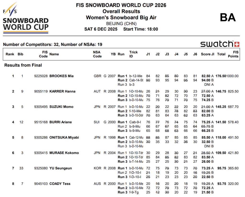 1位はMia Brookes(イギリス)、2位はHanna Karrer(オーストリア)でした。
