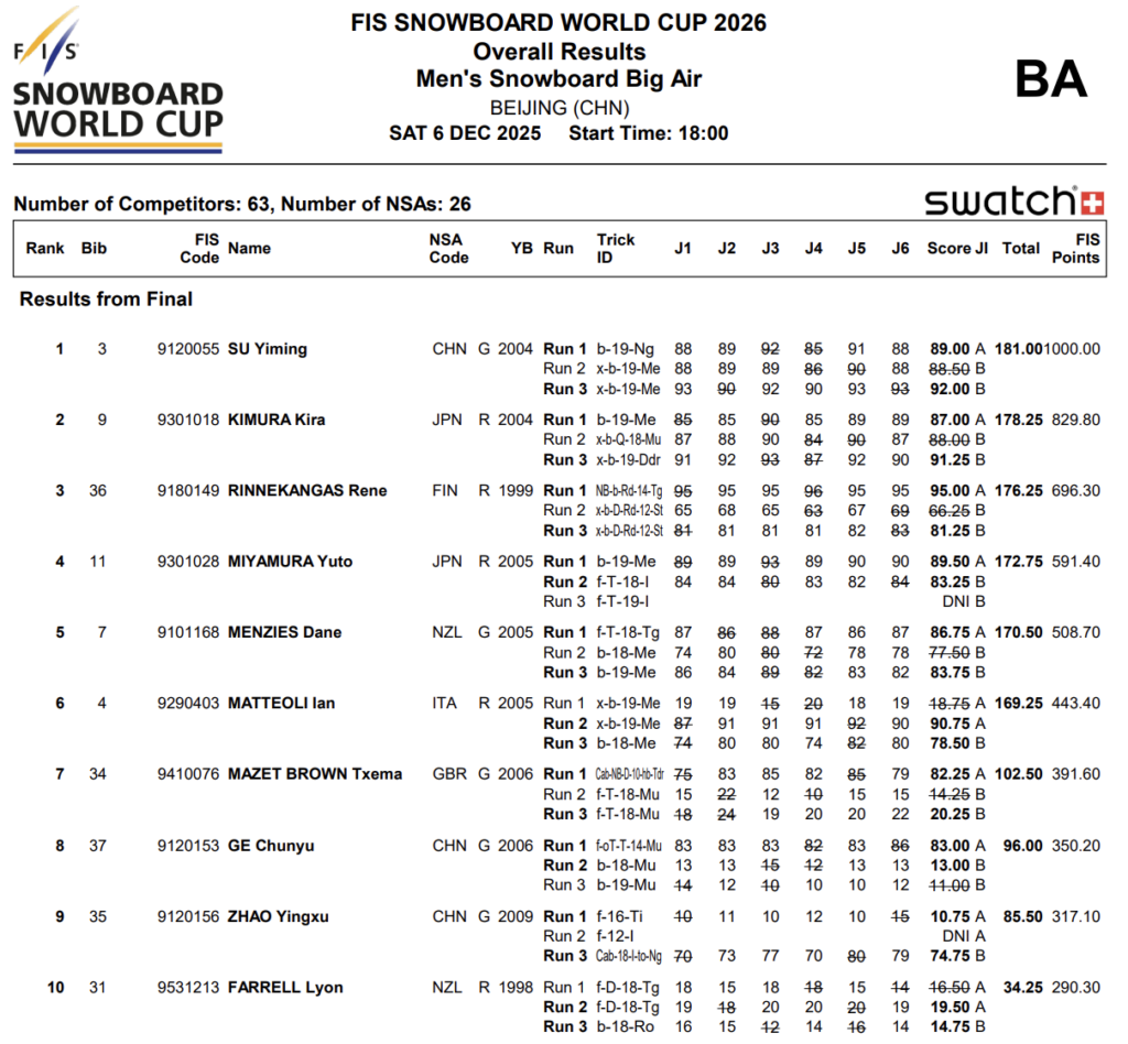 なお、優勝したSu Yimingと木村は、ともに2本のジャンプで同じ技構成を採用しており、僅かな完成度の差が勝敗を分ける結果となりました。
