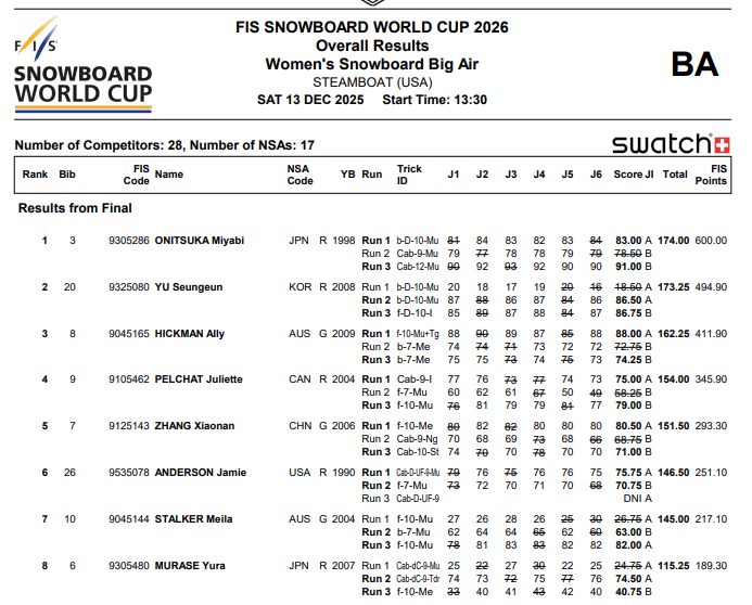 鬼塚雅は、1本目にBS1080(3回転)ウェドル、2本目にCAB900(2回転半)インディを成功させ、2本目終了時点で暫定1位となる。しかし、自身の3本目滑走前に2人の選手に順位を抜かれ、3位に後退。逆転を狙った3本目にCAB1260(3回転半)インディを見事成功させ逆転での1位を獲得しました。この優勝は、鬼塚にとって2019年12月14日の北京ワールドカップ以来、6年ぶりのワールドカップ優勝となりました。