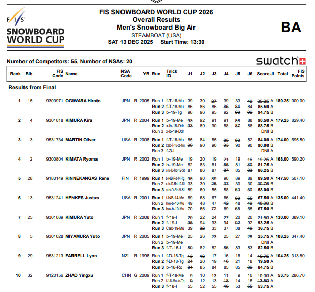 ビッグエアシーズン3戦目。1戦目、2戦目同様にしっかりと表彰台に食い込んだ日本スロープスタイル・ビッグエアチーム。毎大会別の選手が表彰台に上がり、層の厚さを見せつける結果となりました。次戦は2026年1月7日からアメリカ・アスペンにてスロープスタイルの1戦目が行われます。今後の戦いからも目が離せません。