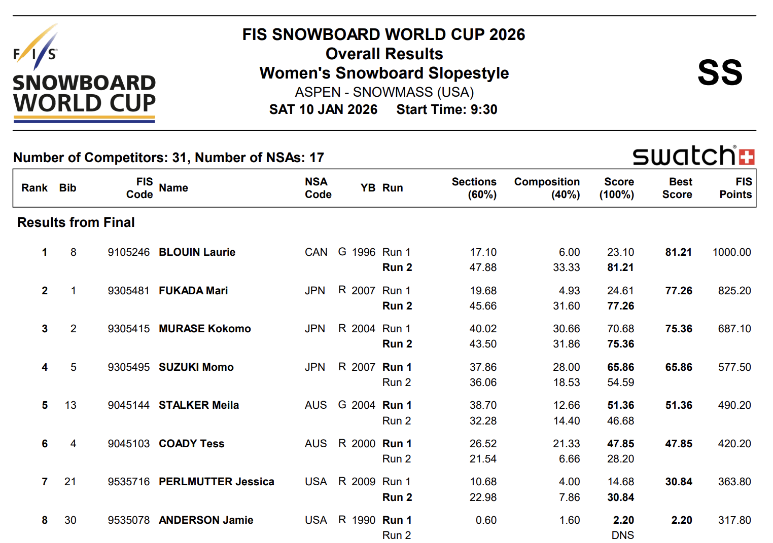 スノーボードのワードカップ(W杯)は現地時間1月10日、アメリカのアスペンでFISスロープスタイル・ワールドカップの決勝が行われました。女子では深田 茉莉(YAMAZEN)が2位、村瀬 心椛(TOKIOインカラミ スノーボード部)が3位を獲得しました。